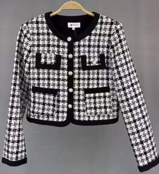 Este saco corto presenta un diseño elegante con borde negro que resalta su silueta. Sus botones de piedra aportan un toque sofisticado y distintivo, mientras que el patrón de cuadras ofrece un estilo clásico adaptable a múltiples ocasiones. Ideal para quienes buscan un balance entre formalidad y modernidad, este saco proporciona versatilidad y presencia cuidada en cada uso.