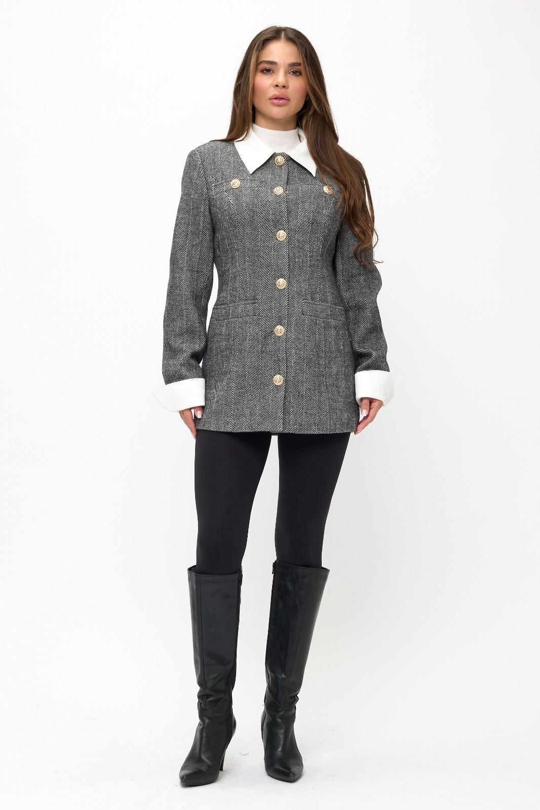 Este saco de cuello blanco combina elegancia y sofisticación, ideal para elevar cualquier atuendo formal o de oficina. Sus botones dorados aportan un detalle distintivo que realza el diseño clásico, mientras que el corte impecable asegura un ajuste cómodo y favorecedor. Perfecto para quienes buscan un estilo pulido y profesional con un toque de exclusividad.