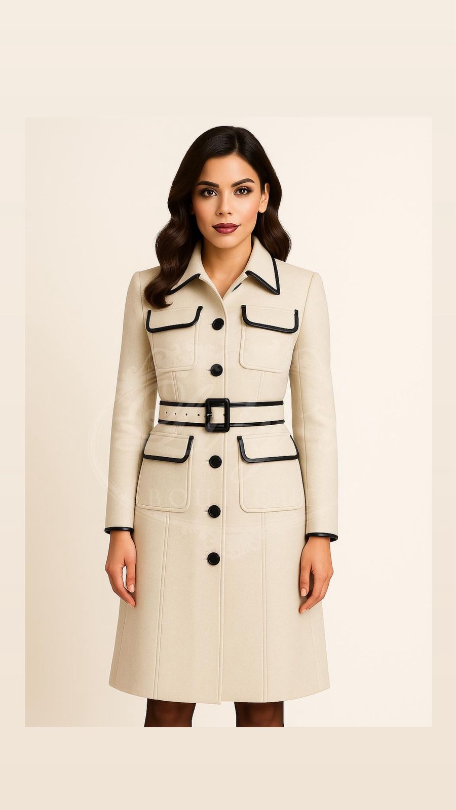 Saco de corte clásico con solapas definidas y borde negro que enmarca elegantemente el frente. Cuenta con cintura ajustable y botones negros que complementan el diseño sofisticado. Pieza versátil ideal para crear looks profesionales o casual-chic. Confeccionado con atención al detalle, este saco es un básico imprescindible en cualquier guardarropa moderno.